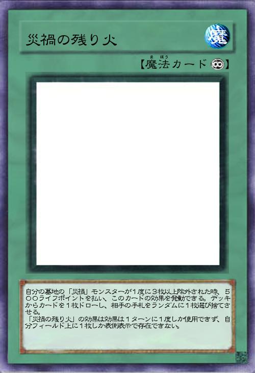 | 自分の墓地の「災禍」モンスターが1度に3枚以上除外された時、500ライフポイントを払い、このカードの効果を発動できる。デッキからカードを1枚ドローし、相手の手札をランダムに1枚選び捨てさせる。 「災禍の残り火」の効果は効果は1ターンに1度しか使用できず、自分フィールド上に1枚しか表側表示で存在できない。 | |||