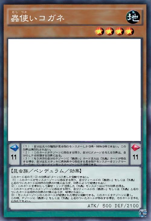 | (1):自分は元々の種族が昆虫族のモンスターしか召喚・特殊召喚できない。この効果は無効化されない。 (2):このカードがPゾーンに存在する限り、自分にダメージを与える効果は、自分のLPを回復する効果になる。 (3):もう片方の自分のPゾーンに「蟲使い」カードまたは「王蟲」カードが存在する場合、自分はEXデッキに表側表示で存在する昆虫族Pモンスターをリンクマーカーの向いていないメインモンスターゾーンにP召喚できる。 | |||