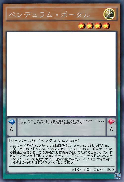 | ①:Pゾーンのこのカードと同じ縦列の自分・相手メインモンスターゾーンには、互いのプレイヤーはEXデッキからモンスターを特殊召喚できる。 | |||