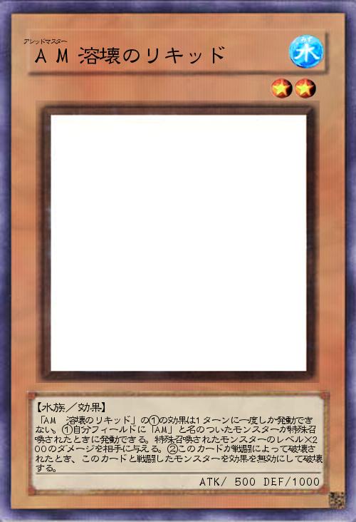 | 「AM 溶壊のリキッド」の①の効果は1ターンに一度しか発動できない。①自分フィールドに「AM」と名のついたモンスターが特殊召喚されたときに発動できる。特殊召喚されたモンスターのレベル×200のダメージを相手に与える。②このカードが戦闘によって破壊されたとき、このカードと戦闘したモンスターを効果を無効にして破壊する。 | |||