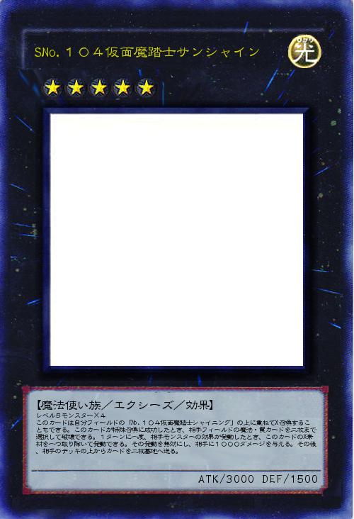 | レベル5モンスター×4 このカードは自分フィールドの「No.104仮面魔踏士シャイニング」の上に重ねてX召喚することもできる。このカードが特殊召喚に成功したとき、相手フィールドの魔法・罠カードを二枚まで選択して破壊できる。1ターンに一度、相手モンスターの効果が発動したとき、このカードのX素材を一つ取り除いて発動できる。その発動を無効にし、相手に1000ダメージを与える。その後、相手のデッキの上からカードを二枚墓地へ送る。 | |||