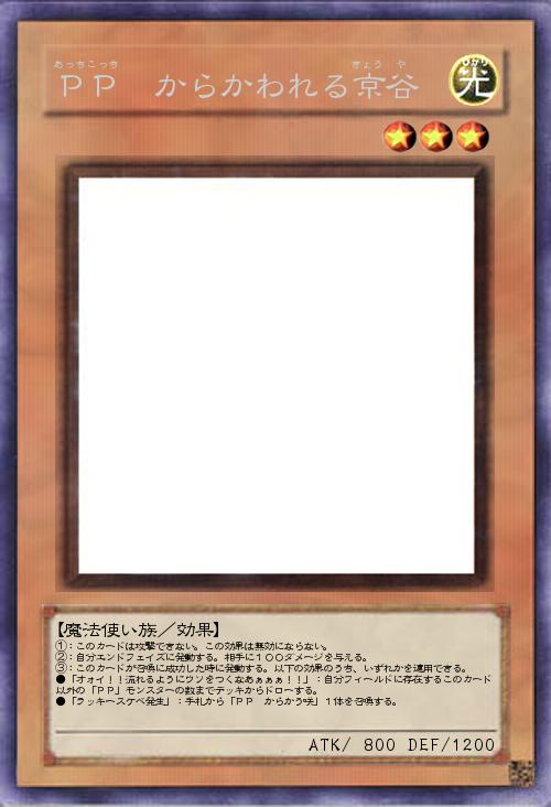 | ①:このカードは攻撃できない。この効果は無効にならない。 ②:自分エンドフェイズに発動する。相手に100ダメージを与える。 ③:このカードが召喚に成功した時に発動する。以下の効果のうち、いずれかを適用できる。 ●「オォイ!!流れるようにウソをつくなあぁぁぁ!!」:自分フィールドに存在するこのカード以外の「PP」モンスターの数までデッキからドローする。 ●「ラッキースケベ発生」:手札から「PP からかう咲」1体を召喚する。 | |||