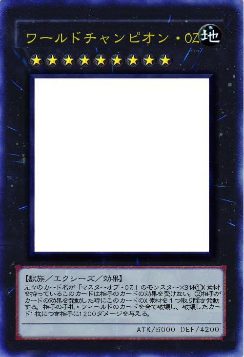 | 元々のカード名が「マスターオブ・OZ」のモンスター×3体①X素材を持っているこのカードは相手のカードの効果を受けない。②相手がカードの効果を発動した時にこのカードのX素材を1つ取り除き発動する。相手の手札・フィールドのカードを全て破壊し、破壊したカード1枚につき相手に1200ダメージを与える。 | |||