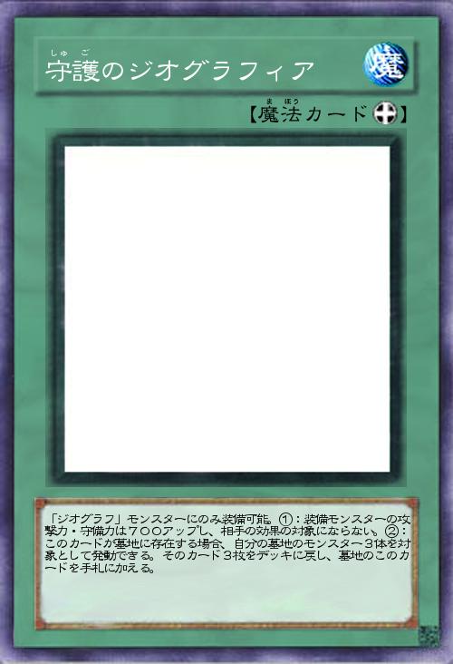 | 「ジオグラフ」モンスターにのみ装備可能。①:装備モンスターの攻撃力・守備力は700アップし、相手の効果の対象にならない。②:このカードが墓地に存在する場合、自分の墓地のモンスター3体を対象として発動できる。そのカード3枚をデッキに戻し、墓地のこのカードを手札に加える。 | |||
