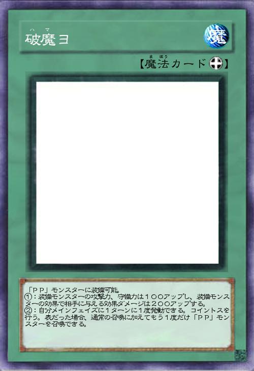 | 「PP」モンスターに装備可能。 ①:装備モンスターの攻撃力、守備力は100アップし、装備モンスターの効果で相手に与える効果ダメージは200アップする。 ②:自分メインフェイズに1ターンに1度発動できる。コイントスを行う。表だった場合、通常の召喚に加えてもう1度だけ「PP」モンスターを召喚できる。 | |||