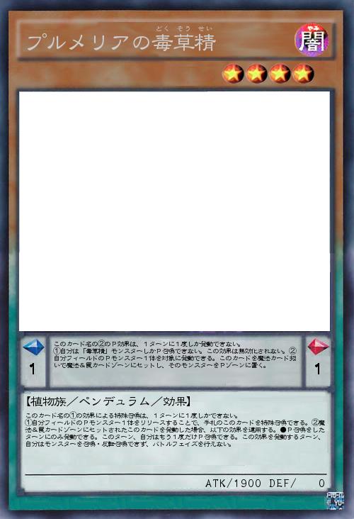 | このカード名の②のP効果は、1ターンに1度しか発動できない。 ①自分は「毒草精」モンスターしかP召喚できない。この効果は無効化されない。②自分フィールドのPモンスター1体を対象に発動できる。このカードを魔法カード扱いで魔法&罠カードゾーンにセットし、そのモンスターをPゾーンに置く。 | |||