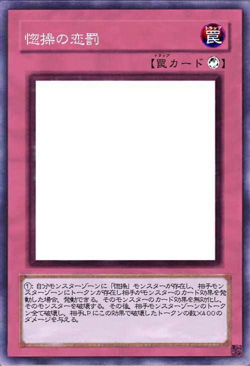 | ①:自分モンスターゾーンに「惚操」モンスターが存在し、相手モンスターゾーンにトークンが存在し相手がモンスターのカード効果を発動した場合、発動できる。そのモンスターのカード効果を無効化し、そのモンスターを破壊する。その後、相手モンスターゾーンのトークン全て破壊し、相手LPにこの効果で破壊したトークンの数×400のダメージを与える。 | |||