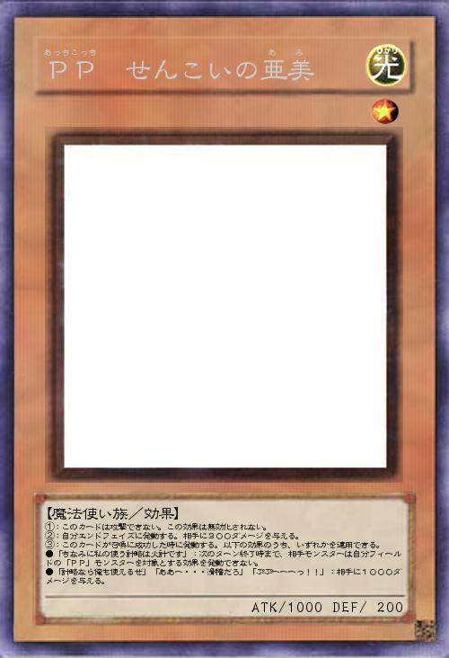 | ①:このカードは攻撃できない。この効果は無効化されない。 ②:自分エンドフェイズに発動する。相手に300ダメージを与える。 ③:このカードが召喚に成功した時に発動する。以下の効果のうち、いずれかを適用できる。 ●「ちなみに私の使う計略は火計です」:次のターン終了時まで、相手モンスターは自分フィールドの「PP」モンスターを対象とする効果を発動できない。 ●「計略なら俺も使えるぜ」「ああー・・・滑稽だろ」「ぷぷーーーっ!!」:相手に1000ダメージを与える。 | |||