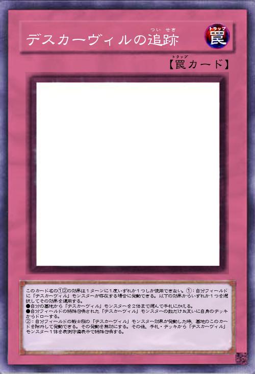 | このカード名の①②の効果は1ターンに1度いずれか1つしか使用できない。①:自分フィールドに「デスカーヴィル」モンスターが存在する場合に発動できる。以下の効果からいずれか1つを選択してその効果を適用する。 ●自分の墓地から「デスカーヴィル」モンスターを2体まで選んで手札に加える。 ●自分フィールドの特殊召喚された「デスカーヴィル」モンスターの数だけお互いに自身のデッキからドローする。 ②:自分フィールドの戦士族の「デスカーヴィル」モンスター効果が発動した時、墓地のこのカードを除外して発動できる。その発動を無効にする。その後、手札・デッキから「デスカーヴィル」モンスター1体を表側守備表示で特殊召喚する。 | |||