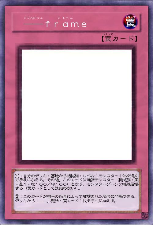 | ①:自分のデッキ・墓地から機械族・レベル1モンスター1体を選んで手札に加える。その後、このカードは通常モンスター(機械族・風・星1・攻100/守100)となり、モンスターゾーンに特殊召喚する(罠カードとしては扱わない)。 ②:このカードが相手の効果によって破壊された場合に発動できる。デッキから「――」魔法・罠カード1枚を手札に加える。 | |||