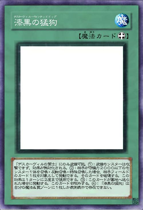 | 「デスカーヴィルの策士」にのみ装備可能。①:装備モンスターは攻撃できず、効果が無効化される。②:相手が守備力2000以下のモンスター1体を召喚・反転召喚・特殊召喚した場合、相手フィールドのカード1枚を対象として発動できる。そのカードを破壊する。この効果は1ターンに2度まで使用できる。③:このカードが墓地へ送られた場合に発動する。このカードを除外する。④:「漆黒の猛狗」は自分の魔法&罠ゾーンに1枚しか表側表示で存在できない。 | |||