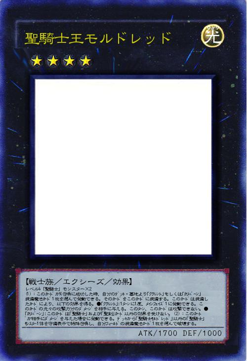 (1):このカードがX召喚に成功した時、自分のデッキ・墓地より「クラレント」もしくは「カリバーン」装備魔法カード1枚を選んで発動できる。そのカードをこのカードに装備する。このカードは装備したカードにより、以下の効果を得る。●「クラレント」:1ターンに1度、メインフェイズ1に発動できる。このカードの元々の攻撃力分のダメージを相手に与える。このターン、このカードは攻撃できない。●「カリバーン」:このカードは「聖騎士」および「聖剣」カード以外の効果を受けない。(2):このカードが相手にダメージを与えた場合に発動できる。デッキから「聖騎士モルドレッド」以外の「聖騎士」モンスター1体を守備表示で特殊召喚し、自分フィールドの装備魔法カード1枚を選んで破壊する。」(2018-09-27 14:41)