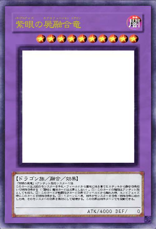 | 「紫眼の屍竜」+アンデット族モンスター1体 このカードは上記のモンスターを手札・フィールドから墓地に送る事でEXデッキから融合召喚扱いで特殊召喚する(「融合」魔法カードは必要としない)。①:このカードの種族はアンデット族としても扱う。②:このカードが戦闘及びカード効果でフィールドから離れた時、エンドフェイズ時にこのカードを特殊召喚する。③:1ターンに1度、相手がモンスターを召喚・特殊召喚に成功した時、そのモンスターの効果を無効にして破壊する。この効果は相手ターンでも発動できる。 | |||