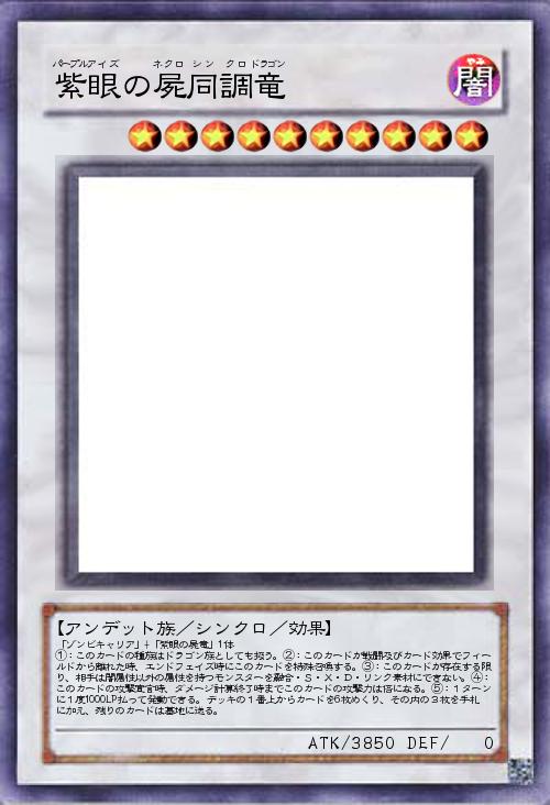 | 「ゾンビキャリア」+「紫眼の屍竜」1体 ①:このカードの種族はドラゴン族としても扱う。②:このカードが戦闘及びカード効果でフィールドから離れた時、エンドフェイズ時にこのカードを特殊召喚する。③:このカードが存在する限り、相手は闇属性以外の属性を持つモンスターを融合・S・X・D・リンク素材にできない。④:このカードの攻撃宣言時、ダメージ計算終了時までこのカードの攻撃力は倍になる。⑤:1ターンに1度1000LP払って発動できる。デッキの1番上からカードを6枚めくり、その内の3枚を手札に加え、残りのカードは墓地に送る。 | |||