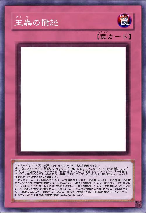 | このカード名の(1)(2)の効果はそれぞれ1ターンに1度しか発動できない。 (1):自分フィールドの「蟲使い」もしくは「王蟲」と名のついたモンスター1体を対象にして1000LP支払い発動できる。デッキから「蟲使い」もしくは「王蟲」と名のついたカード1枚を墓地に送り、対象のモンスターの攻撃力・守備力を1000アップする。その後、墓地に送ったカードの種類に応じて以下の効果を適用する。 ・モンスターカード:対象のモンスターが守備表示モンスターを攻撃した場合、その守備力を攻撃力が超えた分だけ相手に戦闘ダメージを与える。・魔法:対象のモンスターはこのターンのエンドフェイズ時までこのカード以外の効果を受けない。・罠:対象のモンスターが戦闘によってモンスターを破壊した場合に発動できる。そのモンスターの元々の攻撃力分だけ自分のLPを回復する。 (2):墓地のこのカードを除外し、1000LP支払って発動でき | |||
