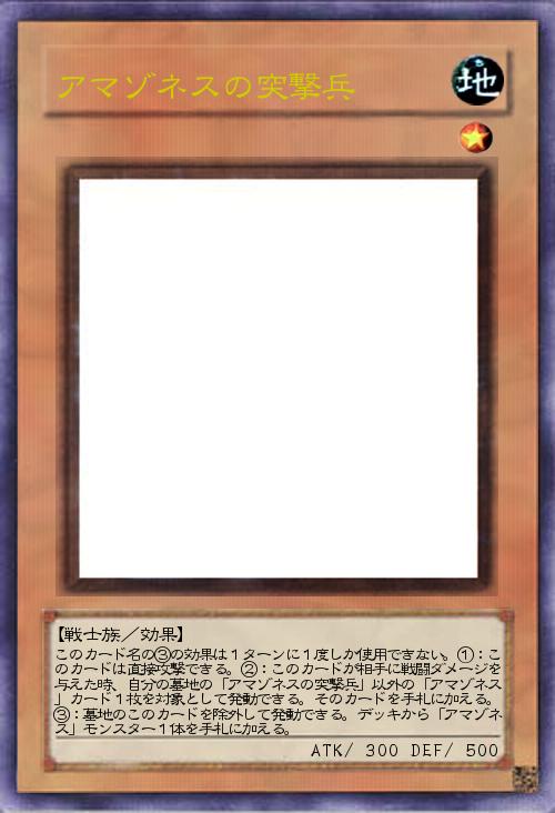 | このカード名の③の効果は1ターンに1度しか使用できない。①:このカードは直接攻撃できる。②:このカードが相手に戦闘ダメージを与えた時、自分の墓地の「アマゾネスの突撃兵」以外の「アマゾネス」カード1枚を対象として発動できる。そのカードを手札に加える。③:墓地のこのカードを除外して発動できる。デッキから「アマゾネス」モンスター1体を手札に加える。 | |||