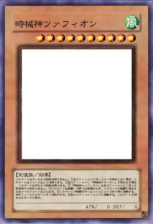| このカードはデッキから特殊召喚できない。①自分フィールドにモンスターが存在しない場合、このカードはリリースなしで召喚できる。②自分フィールドに「時械神サディオン」が存在する場合、このカードは手札から特殊召喚できる。③「時械神ツァフィオン」は自分フィールドに1体しか表側表示で存在できない。④このカードは戦闘・効果では破壊されず、このカードの戦闘で発生する自分へのダメージは0になる。⑤このカードが戦闘を行ったバトルフェイズ終了時に発動する。相手フィールドのカードを一枚除外する。⑥自分スタンバイフェイズに発動する。このカードを持ち主のデッキに戻す。 | |||