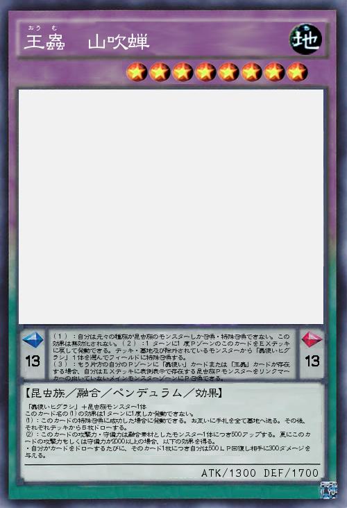 | (1):自分は元々の種族が昆虫族のモンスターしか召喚・特殊召喚できない。この効果は無効化されない。(2):1ターンに1度PゾーンのこのカードをEXデッキに戻して発動できる。デッキ・墓地及び除外されているモンスターから「蟲使いヒグラシ」1体を選んでフィールドに特殊召喚する。 (3):もう片方の自分のPゾーンに「蟲使い」カードまたは「王蟲」カードが存在する場合、自分はEXデッキに表側表示で存在する昆虫族Pモンスターをリンクマーカーの向いていないメインモンスターゾーンにP召喚できる。 | |||