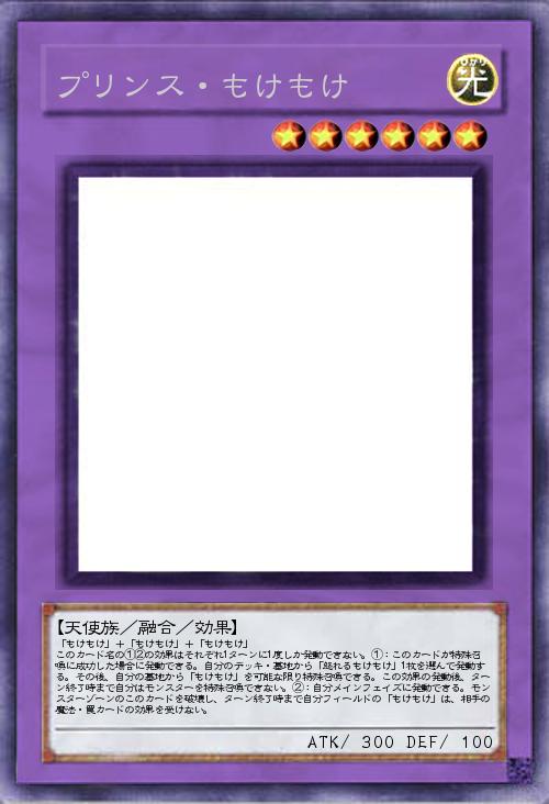 | 「もけもけ」+「もけもけ」+「もけもけ」 このカード名の①②の効果はそれぞれ1ターンに1度しか発動できない。①:このカードが特殊召喚に成功した場合に発動できる。自分のデッキ・墓地から「怒れるもけもけ」1枚を選んで発動する。その後、自分の墓地から「もけもけ」を可能な限り特殊召喚できる。この効果の発動後、ターン終了時まで自分はモンスターを特殊召喚できない。②:自分メインフェイズに発動できる。モンスターゾーンのこのカードを破壊し、ターン終了時まで自分フィールドの「もけもけ」は、相手の魔法・罠カードの効果を受けない。 | |||