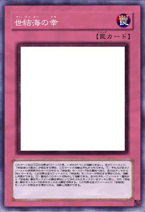 | このカード名の①②の効果は1ターンに1度、いずれか1つしか発動できない。自分フィールドに「世結海の大聖女」が存在する場合、このカードの発動は手札からもできる。①:手札及び自分フィールドの表側表示のカードの中から「世結海」モンスター1体を墓地へ送り、自分はデッキから2枚ドローする。この効果は自分フィールドに「世結海」モンスターが存在する場合にのみ、発動と処理ができる。②:墓地のこのカードを除外して発動できる。自分の手札・フィールド・墓地から「世結海」融合モンスターの融合素材として決められたモンスターをデッキに戻し、その「世結海」融合モンスター1体をEXデッキから融合召喚する。この効果は自分フィールドに「世結海」モンスターが存在する場合にのみ、発動と処理ができる。 | |||