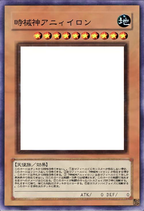 | このカードはデッキから特殊召喚できない。。①自分フィールドにモンスターが存在しない場合、このカードはリリースなしで召喚できる。②自分フィールドに「時械神ハイロン」が存在する場合、このカードは手札から特殊召喚できる。③「時械神アニィイロン」は自分フィールドに1体しか表側表示で存在できない。④このカードは戦闘・効果では破壊されず、このカードの戦闘で発生する自分へのダメージは0になる。⑤このカードが戦闘を行ったバトルフェイズ終了時に発動する。手札をすべて捨て、捨てた枚数だけデッキからドローする。⑥自分スタンバイフェイズに発動する。このカードを持ち主のデッキに戻す。 | |||