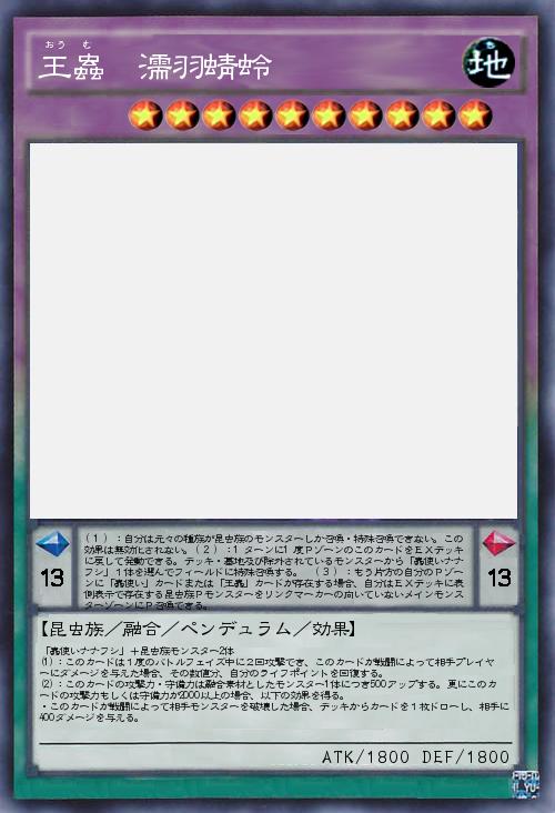 | 「蟲使いナナフシ」+昆虫族モンスター2体 (1):このカードは1度のバトルフェイズ中に2回攻撃でき、このカードが戦闘によって相手プレイヤーにダメージを与えた場合、その数値分、自分のライフポイントを回復する。 (2):このカードの攻撃力・守備力は融合素材としたモンスター1体につき500アップする。更にこのカードの攻撃力もしくは守備力が2000以上の場合、以下の効果を得る。 ・このカードが戦闘によって相手モンスターを破壊した場合、デッキからカードを1枚ドローし、相手に400ダメージを与える。 | |||