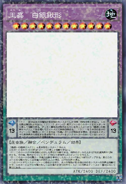 | 「蟲使いの教師オニクワ」+昆虫族モンスター1体以上 このカード名の(1)の効果は1ターンに1度しか発動できない。 (1):このカードの特殊召喚に成功した場合に発動できる。相手のデッキの上から3枚を裏側表示で除外する。その後、除外されているカード1枚につき相手に200ダメージを与える。 (2):このカードの攻撃力・守備力は融合素材としたモンスター1体につき500アップする。更にこのカードの攻撃力もしくは守備力が2500以上の場合、以下の効果を得る。 ・このカードがモンスターゾーンに存在する限り、元々の種族が昆虫族以外のモンスターの効果は発動できず、このカード以下の攻撃力もしくは守備力を持つ相手モンスターの効果はフィールド・墓地において無効になる。 | |||