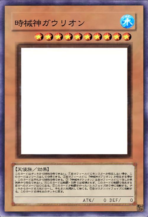 | このカードはデッキから特殊召喚できない。①自分フィールドにモンスターが存在しない場合、このカードはリリースなしで召喚できる。②自分フィールドに「時械神ガブリオン」が存在する場合、このカードは手札から特殊召喚できる。③「時械神ガウリオン」は自分フィールドに1体しか表側表示で存在できない。④このカードは戦闘・効果では破壊されず、このカードの戦闘で発生する自分へのダメージは0になる。⑤このカードが戦闘を行ったバトルフェイズ終了時に発動する。デッキからカードを三枚ドローし、手札を二枚選択して捨てる。⑥自分スタンバイフェイズに発動する。このカードを持ち主のデッキに戻す。 | |||