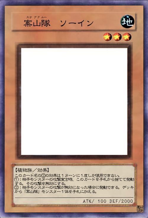 | このカード名の②の効果は1ターンに1度しか使用できない。 ①:相手モンスターの攻撃宣言時、このカードを手札から捨てて発動する。その攻撃を無効にする。 ②:相手モンスターの攻撃が無効になった場合に発動できる。デッキから「案山隊」モンスター1体を手札に加える。 | |||