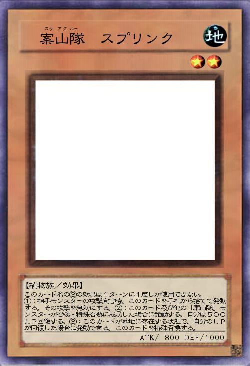 | このカード名の③の効果は1ターンに1度しか使用できない。 ①:相手モンスターの攻撃宣言時、このカードを手札から捨てて発動する。その攻撃を無効にする。②:このカード及び他の「案山隊」モンスターが召喚・特殊召喚に成功した場合に発動する。自分は500LP回復する。③:このカードが墓地に存在する状態で、自分のLPが回復した場合に発動できる。このカードを特殊召喚する。 | |||