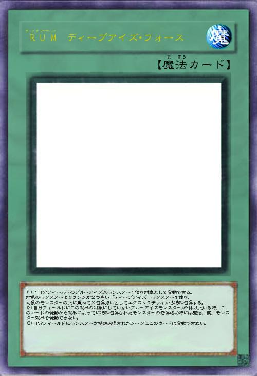 | (1):自分フィールドのブルーアイズXモンスター1体を対象として発動できる。 対象のモンスターよりランクが2つ高い「ディープアイズ」モンスター1体を、 対象のモンスターの上に重ねてX召喚扱いとしてエクストラデッキから特殊召喚する。 (2)自分フィールドにこの効果の対象にしていないブルーアイズモンスターが3体以上いる時、このカードの発動から効果によってに特殊召喚されたモンスターの召喚成功時には魔法、罠、モンスター効果を発動できない。 (3)自分フィールドにモンスターが特殊召喚されたターンにこのカードは発動できない。 | |||