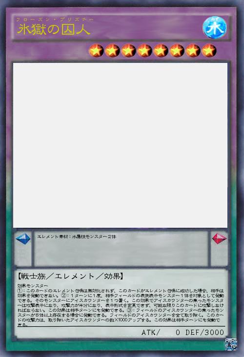 | 効果モンスター ①:このカードのエレメント召喚は無効化されず、このカードがエレメント召喚に成功した場合、相手は効果を発動できない。②:1ターンに1度、相手フィールドの表側表示モンスター1体を対象として発動できる。そのモンスターにアイスカウンターを1つ置く。この効果でアイスカウンターの乗ったモンスターは攻撃表示になり、攻撃力が半分になり、表示形式を変更できず、可能な限りこのカードに攻撃しなければならない。この効果は相手ターンにも発動できる。③:フィールドのアイスカウンターの乗ったモンスターが5体以上存在する場合に発動できる。フィールドのアイスカウンターを全て取り除く。このカードの攻撃力は、取り除いたアイスカウンターの数×1000アップする。この効果は相手ターンにも発動できる。 | |||