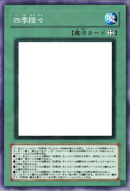 | ①:自分フィールドに「四季神」モンスターが特殊召喚される度に、このカードに四季降々カウンターを1つ置く(最大4つまで)。②:このカードに置かれた四季降々カウンターの数によって、このカードは以下の効果を得る。 ●1つ:自分フィールドに炎属性の「四季神」モンスターが存在する限り、相手は1ターンに1度しか魔法・罠カードを発動できない。 ●2つ:自分フィールドの地属性の「四季神」モンスターと戦闘を行った相手モンスターはダメージ計算後に除外される。 ●3つ:自分フィールドの水属性の「四季神」モンスターの効果で相手フィールドから離れるカードは裏側で除外される。 ●4つ:自分フィールドの風属性の「四季神」モンスターの発動した効果は無効化されない。 ③:このカードに置かれた四季降々カウンターを4つ取り除いて発動できる。自分のデッキ・墓地から「四季神」魔法&罠カード1枚を選んで自分フィールドにセットする。 | |||