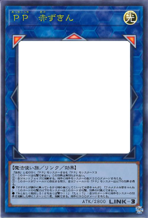 | 「佳奈」と名の付く「PP」モンスターを含む「PP」モンスター×3 ①:このカードは攻撃できない。この効果は無効化されない。 ②:自分エンドフェイズに発動する。相手に相手モンスターの数×200ダメージを与える。 ③:このカードがフィールドに存在する限り、自分フィールドの「PP」モンスターは以下の効果を得る。 ●「オオカミが調子に乗っているから鉢の巣にしてこいってお婆ちゃんが」「フルメタルお婆ちゃんね」:このカードの攻撃力以下のモンスターはこのカードを攻撃、効果の対象にできない。 ●「おとなしく抵抗しろ!さもなくば撃つ!!」「えぇ!?」:自分のターン中に相手モンスターの効果を発動した時に1ターンに1度、発動できる。相手に300ダメージを与える。 | |||