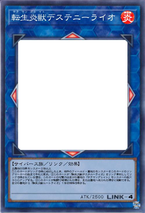 「リンク4のサラマングレイトを作りました。マーカーの向きや攻撃力などはファイアウォール・ドラゴンと共通に。相手のフィールド化墓地のモンスターを実質四枚までバウンスでき、転生リンク召喚することで自己強化、戦闘破壊か墓地へ送られた場合にヒートライオを蘇生できます。」(2018-10-09 01:12)