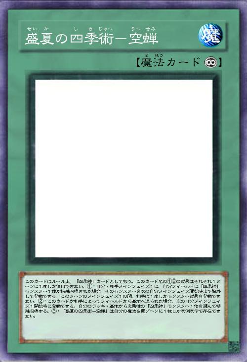| このカードはルール上、「四季神」カードとして扱う。このカード名の①②の効果はそれぞれ1ターンに1度しか使用できない。①:自分・相手メインフェイズ1に、自分フィールドに「四季神」モンスター1体が特殊召喚された場合、そのモンスターを次の自分メインフェイズ開始時まで除外して発動できる。このターンのメインフェイズ1の間、相手は1度しかモンスター効果を発動できない。②:このカードが相手によってフィールドから墓地へ送られた場合、次の自分メインフェイズ1開始時に発動できる。自分のデッキ・墓地から炎属性の「四季神」モンスター1体を選んで特殊召喚する。③:「盛夏の四季術-空蝉」は自分の魔法&罠ゾーンに1枚しか表側表示で存在できない。 | |||