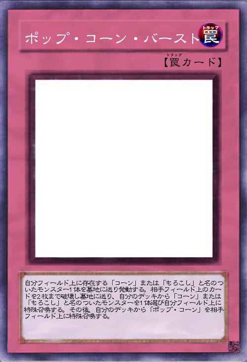 | 自分フィールド上に存在する「コーン」または「もろこし」と名のついたモンスター1体を墓地に送り発動する。相手フィールド上のカードを2枚まで破壊し墓地に送り、自分のデッキから「コーン」または「もろこし」と名のついたモンスターを1体選び自分フィールド上に特殊召喚する。その後、自分のデッキから「ポップ・コーン」を相手フィールド上に特殊召喚する。 | |||