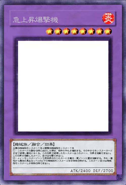 | 炎属性機械族モンスター1体+闇属性機械族モンスター1体 ①:このカードの融合召喚に成功した場合、相手の手札を確認する。その中からモンスターカードを全て破壊し墓地におくる。この効果で破壊したモンスターはこのターン、効果を発動できない。この効果を発動したターン、自分は攻撃できない。 ②:メインモンスターゾーンで表側表示のこのカードを魔法・罠ゾーンに置き発動する。手札・墓地から属性の異なるレベル4以下の機械族モンスター2体を特殊召喚する。このターン自分は機械族モンスターしか特殊召喚できない。 | |||