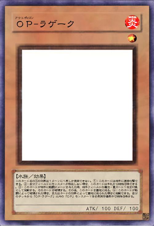 | このカード名の④の効果は1ターンに1度しか使用できない。①:このカードは相手に直接攻撃できる。②:自分フィールドにモンスターが存在しない場合、このカードは手札から特殊召喚できる。③:このカードが相手に戦闘ダメージを与えた時、相手フィールドの魔法・罠カード1枚を対象にして発動する。そのカードを破壊する。その後、このカードを墓地に送る。④:このカードが戦闘によって破壊された場合、またはカードの効果によって墓地に送られた場合に発動できる。自分のデッキから「OP-ラゲーク」以外の「OP」モンスター1体を表側守備表示で特殊召喚する。 | |||