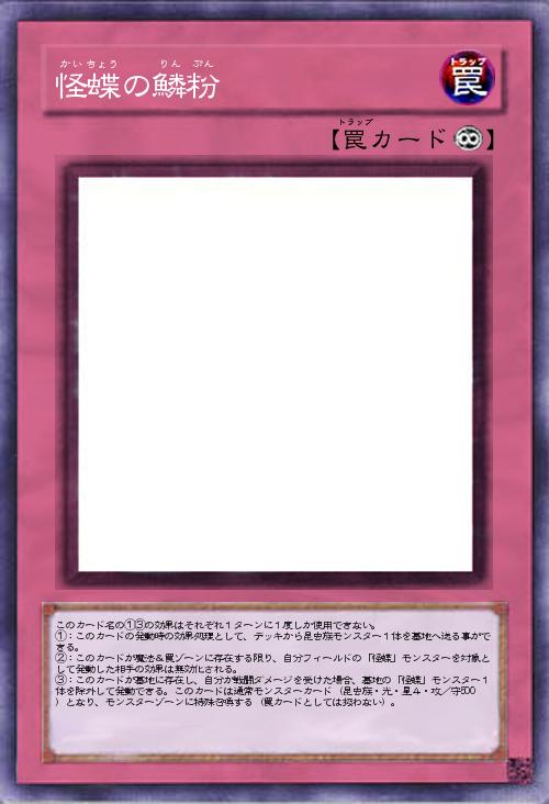 | このカード名の①③の効果はそれぞれ1ターンに1度しか使用できない。 ①:このカードの発動時の効果処理として、デッキから昆虫族モンスター1体を墓地へ送る事ができる。 ②:このカードが魔法&罠ゾーンに存在する限り、自分フィールドの「怪蝶」モンスターを対象として発動した相手の効果は無効化される。 ③:このカードが墓地に存在し、自分が戦闘ダメージを受けた場合、墓地の「怪蝶」モンスター1体を除外して発動できる。このカードは通常モンスターカード(昆虫族・光・星4・攻/守500)となり、モンスターゾーンに特殊召喚する(罠カードとしては扱わない)。 | |||