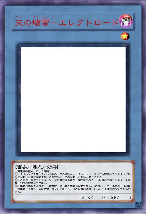| 「超電子の儀式」により降臨。 ①:1ターンに1度、フィールドの「天の壊雷-エレクトロード」以外の雷族儀式モンスターが効果を発動した時に発動する。この効果は、その発動した効果と同じになる。 ②:このカードがモンスターゾーンに存在する限り、相手はこのカード以外の雷族モンスターを攻撃・効果の対象にできない。 ③:儀式召喚したこのカードが墓地へ送られた場合に発動できる。自分のデッキ・墓地の、「超電子の儀式」1枚と「天の壊雷-エレクトロード」以外の雷族儀式モンスター1体を選んで手札に加える。 | |||
