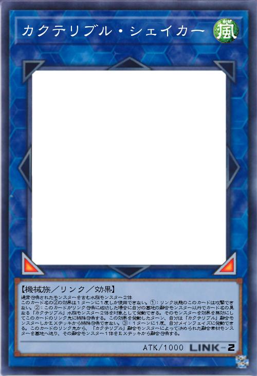 | 通常召喚されたモンスターを含む水族モンスター2体 このカード名の②の効果は1ターンに1度しか使用できない。①:リンク状態のこのカードは攻撃できない。②:このカードがリンク召喚に成功した場合に自分の墓地の融合モンスター以外でカード名の異なる「カクテリブル」水族モンスター2体を対象として発動できる。そのモンスターを効果を無効にしてこのカードのリンク先に特殊召喚する。この効果を発動したターン、自分は「カクテリブル」融合モンスターしかEXデッキから特殊召喚できない。③:1ターンに1度、自分メインフェイズに発動できる。このカードのリンク先から、「カクテリブル」融合モンスターによって決められた融合素材モンスターを墓地へ送り、その融合モンスター1体をEXデッキから融合召喚する。 | |||