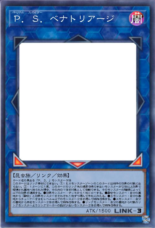 | カード名の異なる「P.S.」モンスター3体 このカードはリンク素材にできない。①:EXモンスターゾーンのこのカードは相手の効果の対象にならない。②:1ターンに1度、このカードのリンク先の通常召喚できないモンスターが2体以上効果で破壊され墓地へ送られた場合、その内の1体を対象として発動できる。そのモンスターの種類によって以下の効果を適用する。●効果モンスター:デッキから1枚ドローする。●融合モンスター:自分の墓地から「融合」と効果モンスターをそれぞれ1枚ずつ選んで手札に加える。●Sモンスター:自分の墓地からチューナーを含むレベル4以下のモンスター2体を選んで特殊召喚する。●Xモンスター:自分の墓地から同名モンスター2体を選んで特殊召喚する。●リンクモンスター:自分の墓地から対象のリンクモンスターよりリンクマーカーの数が少ないモンスター2体を選んで特殊召喚する。 | |||