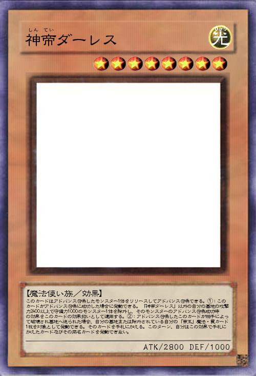 | このカードはアドバンス召喚したモンスター1体をリリースしてアドバンス召喚できる。①:このカードがアドバンス召喚に成功した場合に発動できる。「神帝ダーレス」以外の自分の墓地の攻撃力2400以上で守備力1000のモンスター1体を除外し、そのモンスターのアドバンス召喚成功時の効果をこのカードの効果扱いとして適用する。②:アドバンス召喚したこのカードが相手によって破壊され墓地へ送られた場合、自分の墓地または除外されている自分の「帝王」魔法・罠カード1枚を対象として発動できる。そのカードを手札に加える。このターン、自分はこの効果で手札に加えたカード及びその同名カードを発動できない。 | |||