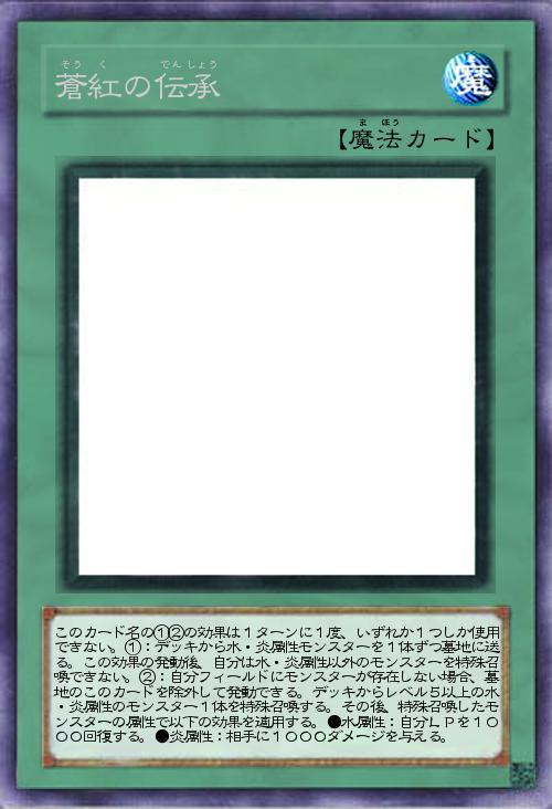 | このカード名の①②の効果は1ターンに1度、いずれか1つしか使用できない。①:デッキから水・炎属性モンスターを1体ずつ墓地に送る。この効果の発動後、自分は水・炎属性以外のモンスターを特殊召喚できない。②:自分フィールドにモンスターが存在しない場合、墓地のこのカードを除外して発動できる。デッキからレベル5以上の水・炎属性のモンスター1体を特殊召喚する。その後、特殊召喚したモンスターの属性で以下の効果を適用する。●水属性:自分LPを1000回復する。●炎属性:相手に1000ダメージを与える。 | |||