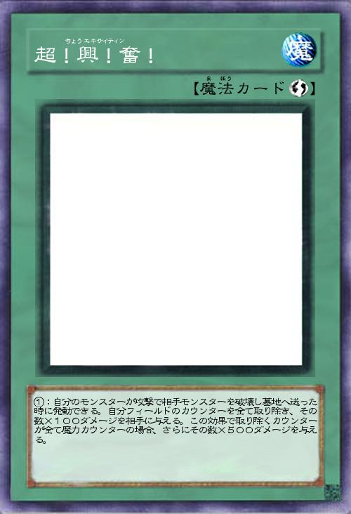 自分モンスターの攻撃で相手モンスターを戦闘破壊することで、発動ができ自分フィールドのカウンターすべてを取り除いてその数×100シュゥーッ!そんでもって魔力カウンターだった場合には追加で数×500のシュゥーッ!っと超エキサイティンなカード(バーン量的に。