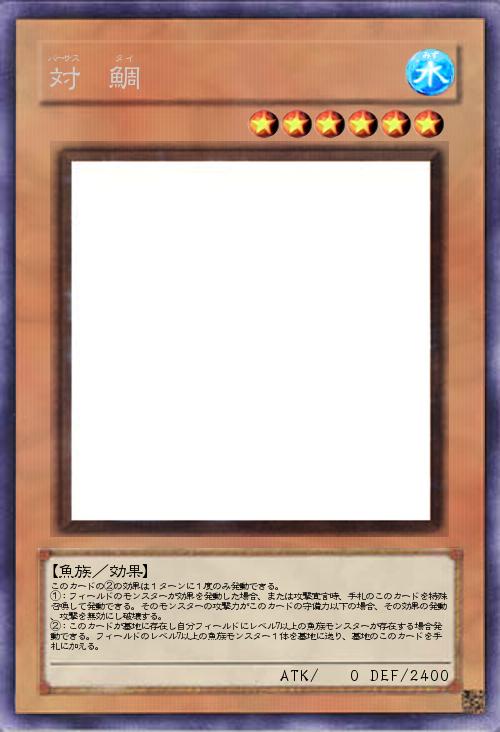| このカードの②の効果は1ターンに1度のみ発動できる。 ①:フィールドのモンスターが効果を発動した場合、または攻撃宣言時、手札のこのカードを特殊召喚して発動できる。そのモンスターの攻撃力がこのカードの守備力以下の場合、その効果の発動、攻撃を無効にし破壊する。 ②:このカードが墓地に存在し自分フィールドにレベル7以上の魚族モンスターが存在する場合発動できる。フィールドのレベル7以上の魚族モンスター1体を墓地に送り、墓地のこのカードを手札に加える。 | |||