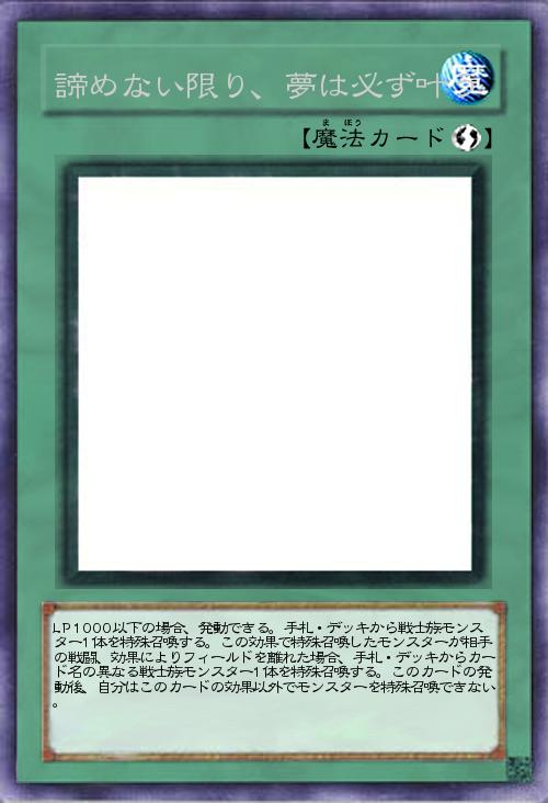 | LP1000以下の場合、発動できる。手札・デッキから戦士族モンスター1体を特殊召喚する。この効果で特殊召喚したモンスターが相手の戦闘、効果によりフィールドを離れた場合、手札・デッキからカード名の異なる戦士族モンスター1体を特殊召喚する。このカードの発動後、自分はこのカードの効果以外でモンスターを特殊召喚できない。 | |||