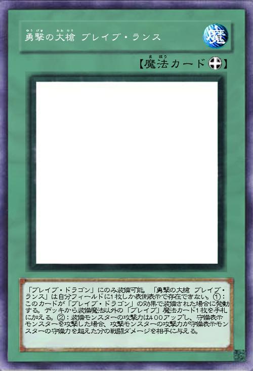 | 「ブレイブ・ドラゴン」にのみ装備可能。「勇撃の大槍 ブレイブ・ランス」は自分フィールドに1枚しか表側表示で存在できない。①:このカードが「ブレイブ・ドラゴン」の効果で装備された場合に発動する。デッキから装備魔法以外の「ブレイブ」魔法カード1枚を手札に加える。②:装備モンスターの攻撃力は400アップし、守備表示モンスターを攻撃した場合、攻撃モンスターの攻撃力が守備表示モンスターの守備力を超えた分の戦闘ダメージを相手に与える。 | |||