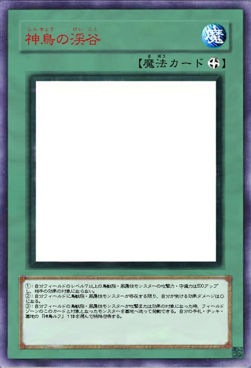 | ①:自分フィールドのレベル7以上の鳥獣族・風属性モンスターの攻撃力・守備力は500アップし、相手の効果の対象にならない。 ②:自分フィールドに鳥獣族・風属性モンスターが存在する限り、自分が受ける効果ダメージは0になる。 ③:自分フィールドの鳥獣族・風属性モンスターが攻撃または効果の対象になった時、フィールドゾーンのこのカードと対象となったモンスターを墓地へ送って発動できる。自分の手札・デッキ・墓地の「神鳥ルフ」1体を選んで特殊召喚する。 | |||